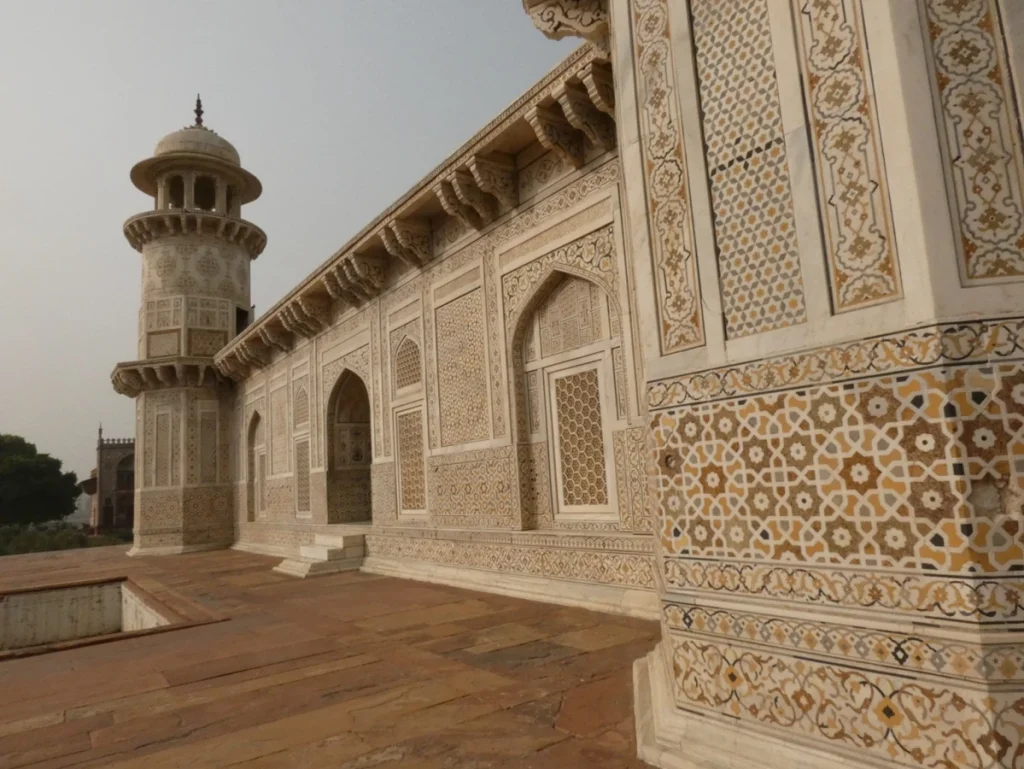 Tal es el caso del Itmad-ud-Daula, un pequeño mausoleo en mármol blanco con incrustaciones de colores en su decoración, predecesora del Taj, pero a la que se adelantó en casi medio siglo. Construido entre 1622 y 1628 representa la transición entre la primitiva arquitectura moghul que utilizaba arenisca roja y el nuevo periodo en el que prima el mármol blanco.