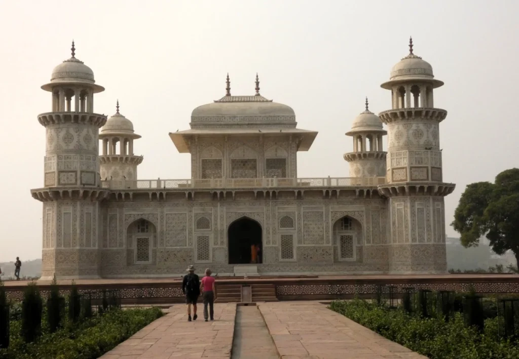 El mausoleo honra la memoria de Mirza Ghiyas Beg, un ministro del emperador Akbar y que fue construido por su hija, quizá la mujer más fascinante del imperio. Este hombre había nacido en Teherán, en el imperio persa, hijo de una familia bien considerada en la que se encontraban poetas y altos funcionarios y él mismo llegó a ocupar un puesto distinguido en la corte, gracias a su inteligencia y educación. Pero a sus muchas habilidades había que añadir que tenía la mano muy larga y pillado en un oscuro asunto de dineros tuvo que salir del país con una mano delante y toda su familia detrás.